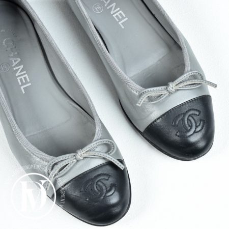 Victime de son succès590,00€Le prix initial était : 590,00€.484,22€Le prix actuel est : 484,22€.Ballerines en cuir de veau lisse gris Chanel