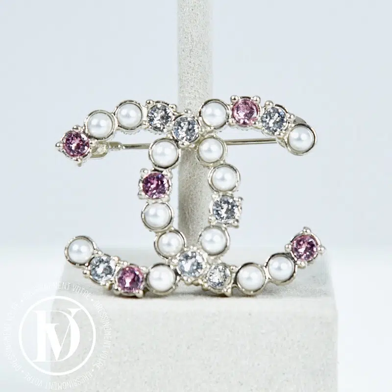 Broche CC en métal champagne, perles et strass – Chanel