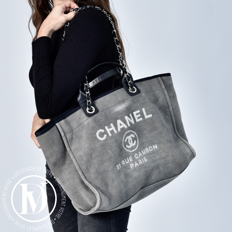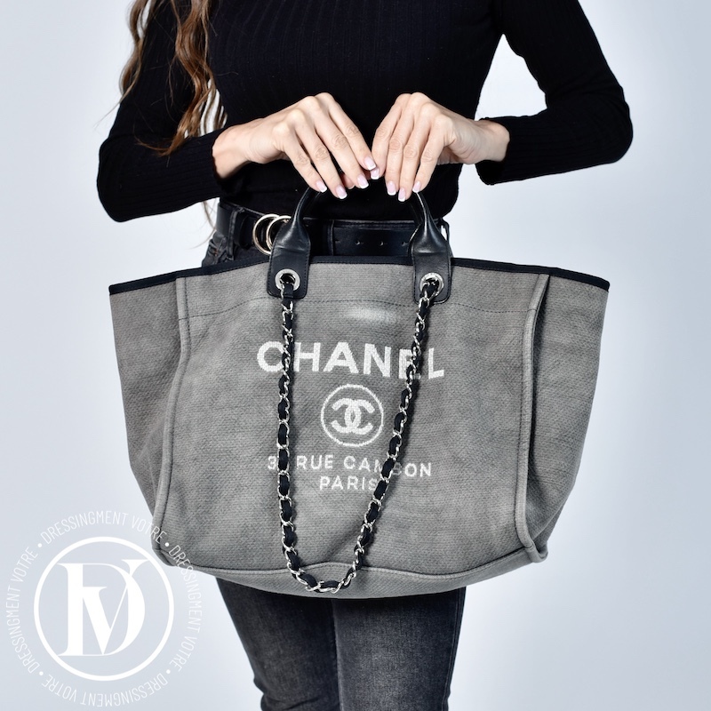 Achetez notre Cabas Deauville en toile grise et cuir noir - Chanel dans la gamme Sacs portés main luxe occasion pour femmes créé par la grande maison de luxe Chanel