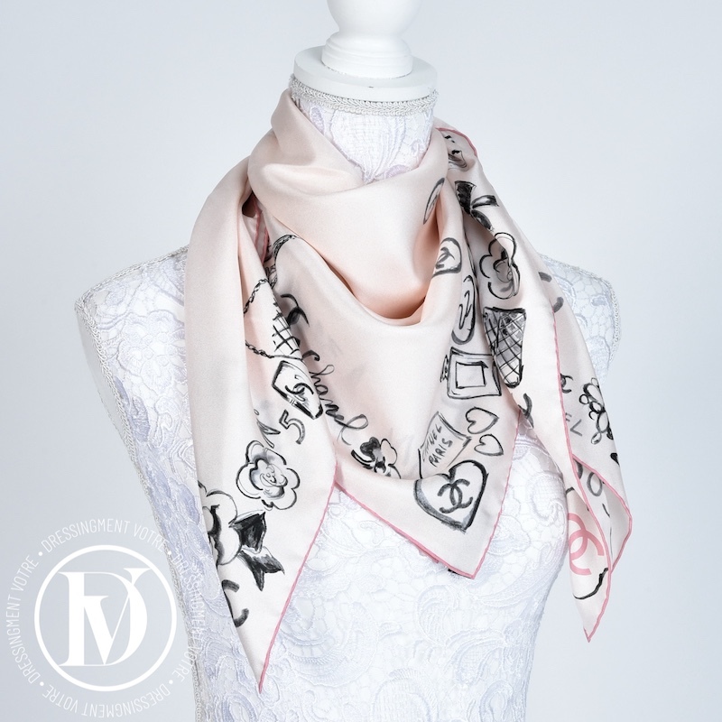 Appréciez notre Carré 90 en twill de soie rose pâle - Chanel dans la catégorie Cadeaux de luxe d'occasion pour femmes élaboré par la grande maison de luxe Chanel
