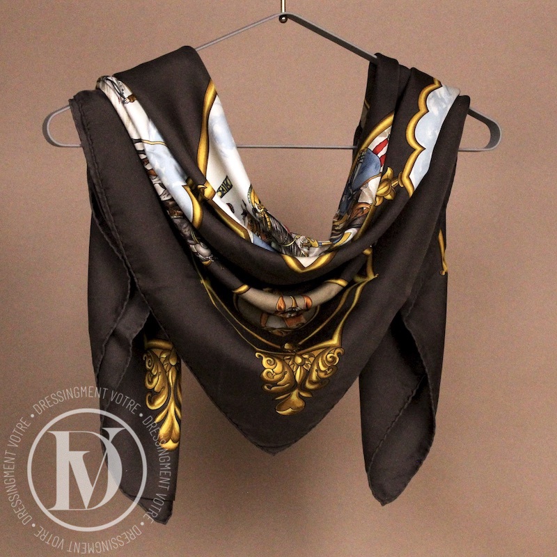 Appréciez notre Carré 90 Les Chevaux des Moghols en soie - Hermès dans la catégorie Cadeaux de luxe d'occasion pour femmes élaboré par la grande maison de luxe Hermès