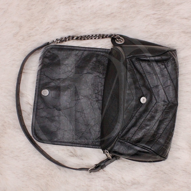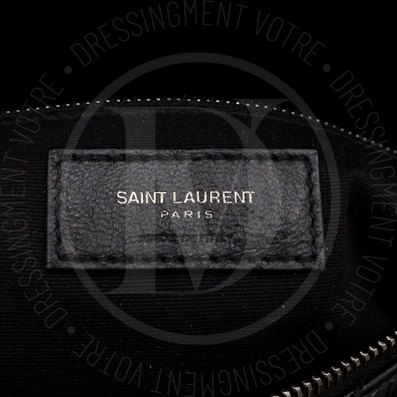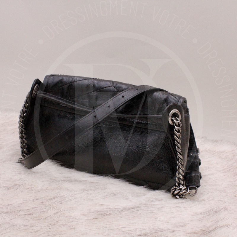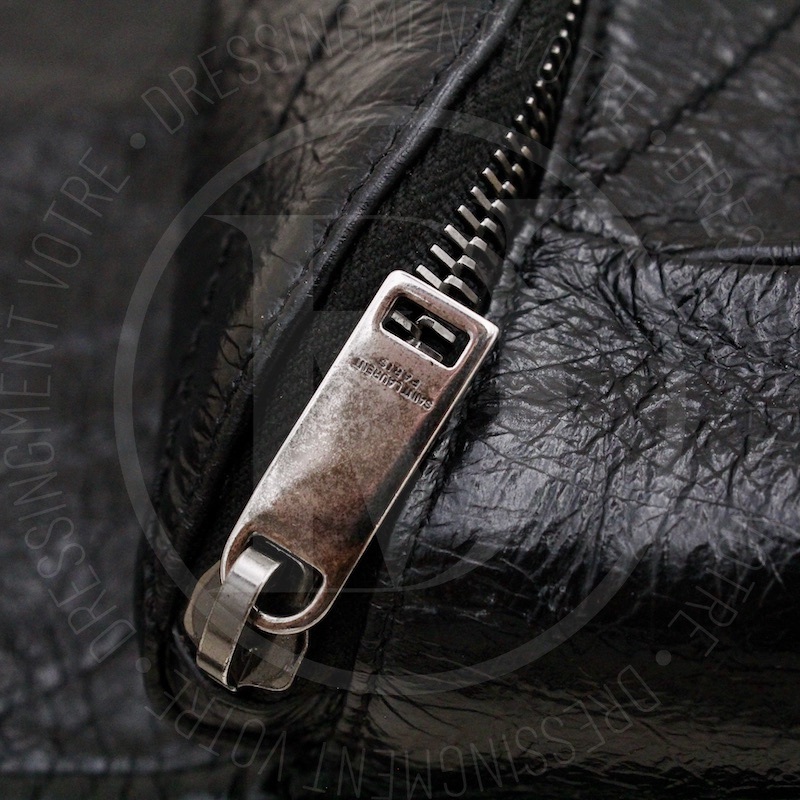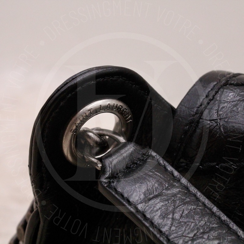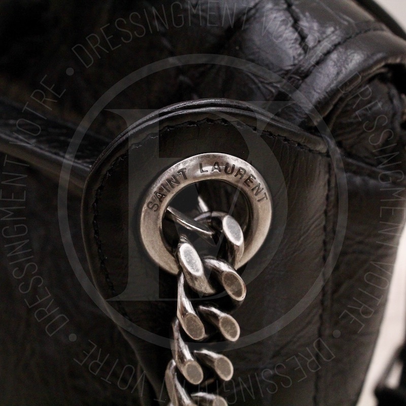 Finitions métalliques YSL en cuir noir et chaîne argentée vieillie