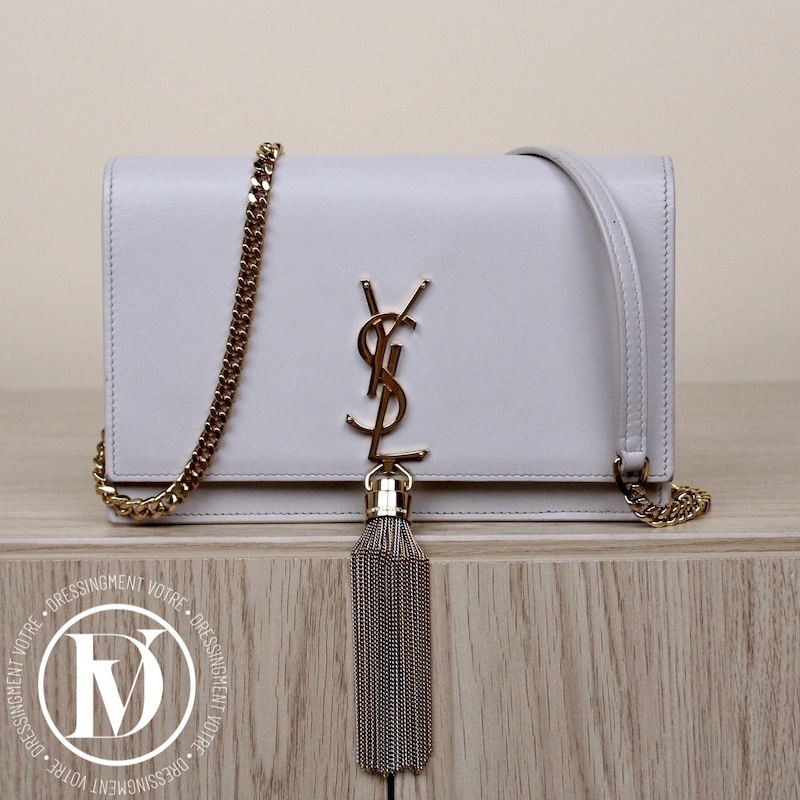 Appréciez notre Sac Kate Chain Wallet pompon en cuir blanc cassé - Saint Laurent dans la catégorie Sac porté épaule de luxe de seconde main pour femmes élaboré par la grande maison de luxe Saint Laurent