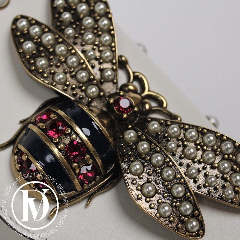 Grosse abeille (14,5 x 8 cm) en métal doré orné en perles nacrées et de cristaux rouges sur le rabat